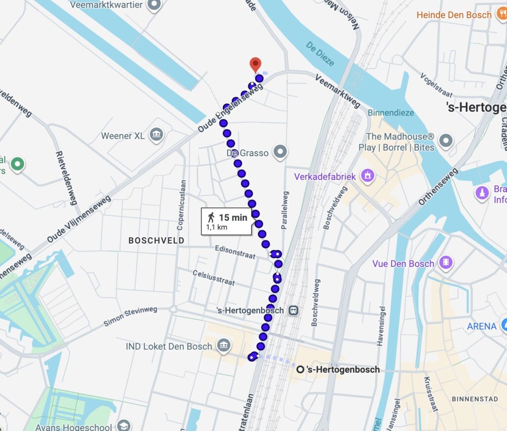 From ‘s-Hertogenbosch’s train station to the 1931 Congressum Centrum is 15 minutes walking (1.1km).